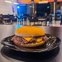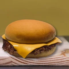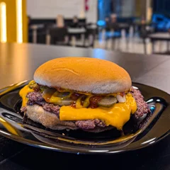 Pão branco, dois hambúrgueres de carne bovina selecionadas "smeshadas e crocantes" com 60g cada e 2 fatias de queijo cheddar!