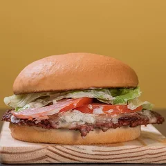 Pão branco, dois hambúrgueres de carne bovina “smeshadas” e crocantes de 60g cada, duas fatia de queijo cheddar, alface, tomate, cebola e deliciosa maionese da casa.
